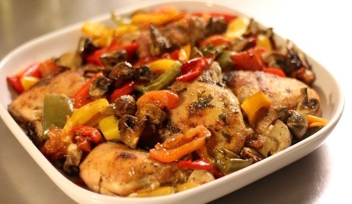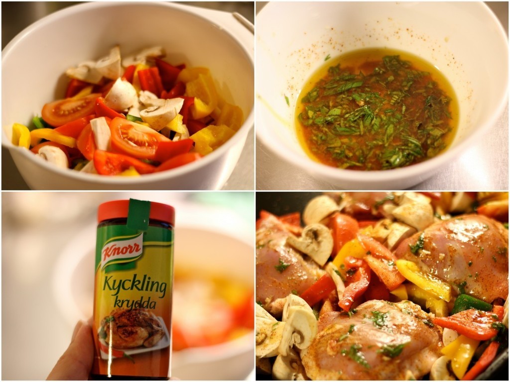 Skär grönsakerna i bitar eller klyftor. Bred ut i en form eller på en plåt tillsammans med kycklinglåren. Blanda olivolja och saften från en halv citron. Skala av lite citronskal och blanda ner det också. Hacka basilikan och blanda ner den. Krydda efter smak och häll marinaden över grönsakerna och kycklingen. Grilla i ugnen på 200° i ca 45-55 minuter. Enkelt, nyttigt och gott!
