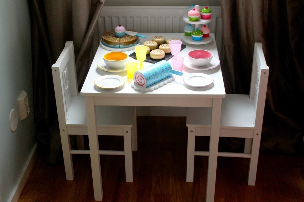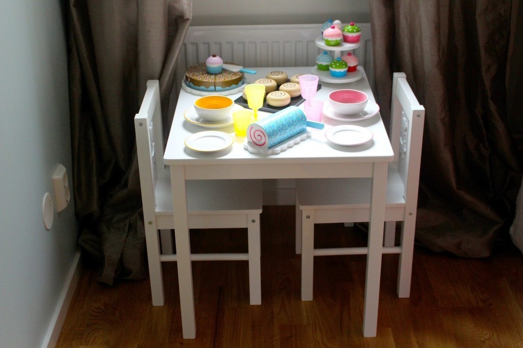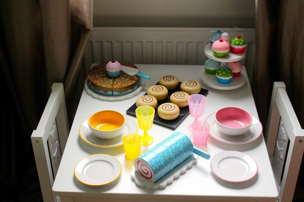 tallrikar, glas och möbler från Ikea, träleksakerna är från Lekoteket och från Lekmer