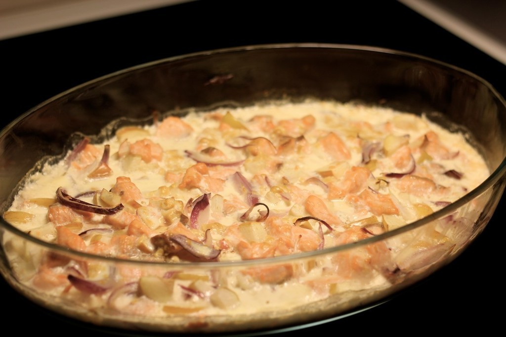 Sätt ugnen på 225°. Skär laxen i tärningar och krydda med salt. Skala och skiva löken . Skala, kärna ur äpplena och skär i tärningar. Blanda lax, lök och äpplen och lägg allt i en ugnsform. Blanda grädde med senap och häll över. In i ugnen ca 15-20 minuter tills laxen är färdig. Jag var skeptisk till äpplena men snacka om att bli överraskad. Det här vart jätte gott och hur enkelt som helst! Ska göra om denna rätt i helgen när min mamma och morbror kommer till mig men ska ändra om lite. Hittade receptet inne på Arla när jag sökte efter inspiration.