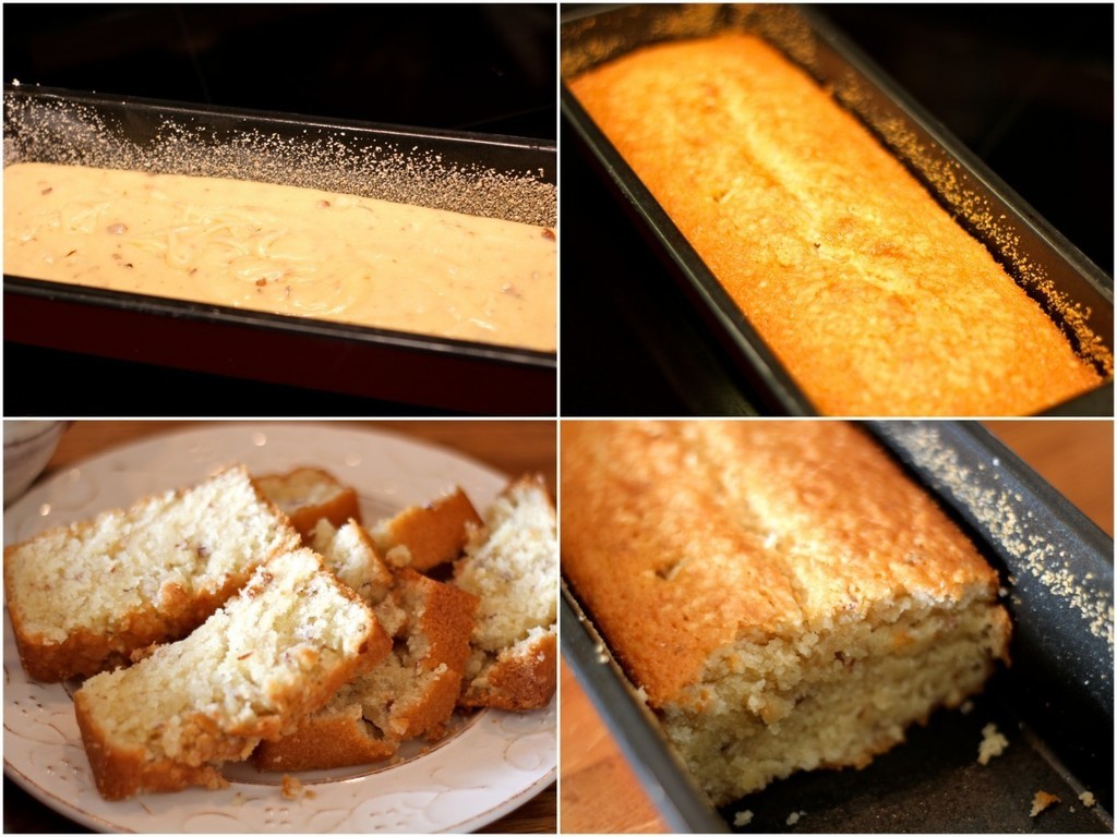 Smält smöret och låt det kallna. Rör ihop socker, vetemjöl. bakpulver, vaniljsocker. Tillsätt mandlarna och  aromen. Blanda smör, ägg och mjölk i en annan bunke och rör sedan ner i vetemjölsblandningen. Smörj och bröa en form. Häll ner smeten i formen och grädda i nedre delen av ugnen på 175° i ca 50 minuter. Prova med en sticka om kakan är färdig.