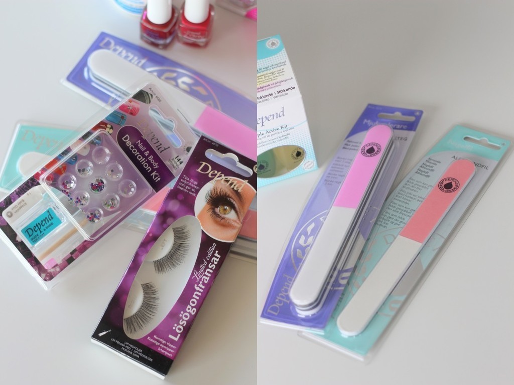en allround nagelfil och en mjukpolerare, lösögonfransar och ett dekorationskit för naglarna