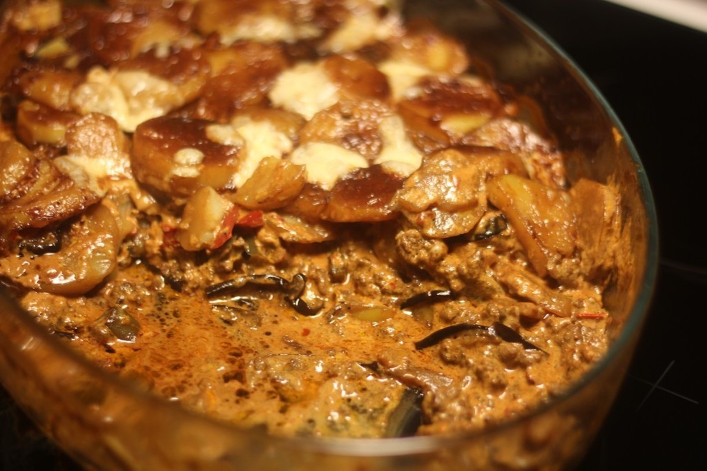 Sätt ugnen på 200°.Koka eller ångkoka potatisarna. Skiva auberginen och stek skivorna mjuka. Hacka paprika och stek tillsammans med köttfärsen. Krydda med salt och peppar. Skiva potatisen och varva potatis, aubergine skivorna och köttfärsblandningen. Jag la ett lager potatis först och sen ett lager med aubergine skivor. Hällde på hela köttfärsblandningen och la på ett till lager med aubergine skivor och avslutade med ett lager potatis. Blanda grädde, crème fraîche, soya, ayvar, chiliflingor, paprika krydda, salt och peppar i en kastrull. Koka upp och häll över gratängen. Strö över lite riven ost och gratinera i ca 20 minuter tills allt har fått en fin färg.