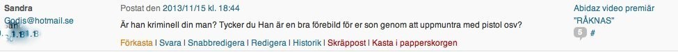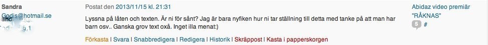 På riktigt? Ja du jag sitter och funderar ifall du var seriös med din kommentar eller inte? Du undrar ifall min man är kriminell för att han har medverkat i en musikvideo tillsammans med två skådespelare från Snabba cash och ifall jag tycker att han är en bra förebild för vår son eftersom han viftar med en pistol? Du vet att videon inte är på riktigt va? Precis som att King Kong inte finns på riktigt och det bara var en film. Jag tycker han är en utmärkt förebild och vi är otroligt stolta över honom. Uppmuntra med pistol? Tänker du så generellt om alla filmer, videos, serier och produktioner eller gäller det bara min man? Tänker du ifall Peter Haber är en bra förebild när han är en fullblodspsykopat i Män som hatar kvinnor? Eller ifall Matias Varela är en bra förebild när han skjuter folk i Snabba cash? Du undrar hur vi tar ställning till sådana texter. Jag tar ställning på samma sätt som med allt annat som visas på tv och filmer. Det är inte verklighet utan fiktion. Jag kommer lära min son vad som är rätt och fel. Jag kommer definitivt inte gömma omvärlden för honom.