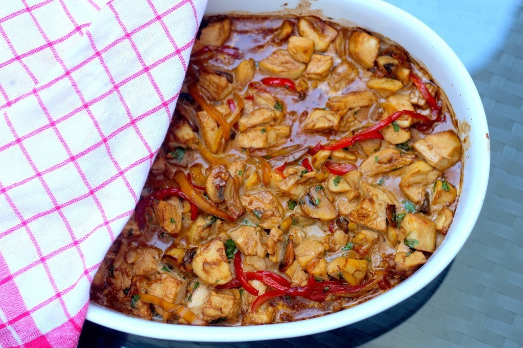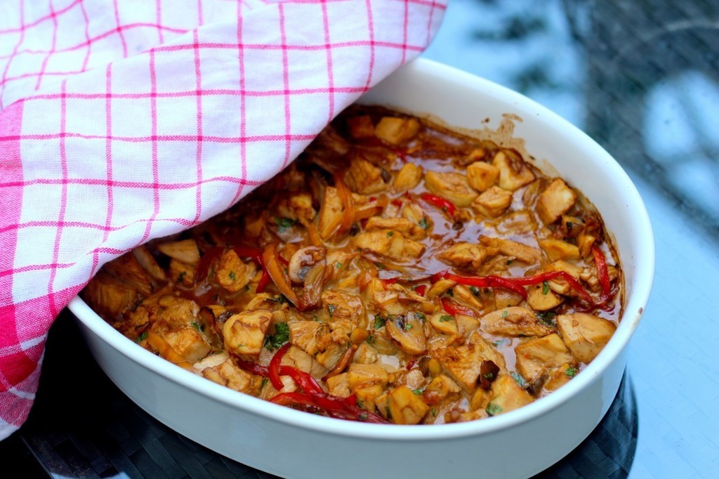 Sätt ugnen på 200°. Strimla och stek kycklingfilen eller dela den grillade kycklingen i bitar. Strimla paprikan och stek med kycklingen. Krydda med salt & peppar. Skär champinjonerna och stek dem på sidan. Krydda med peppar. Blanda ner med kycklingen och häll allt i en form. Blanda grädde, crème fraîche, soya, persilja och senap. Smaka av med salt & peppar. Häll över kycklingen och strö över lite riven ost. Tillaga i ugnen ca 20-25 minuter.
