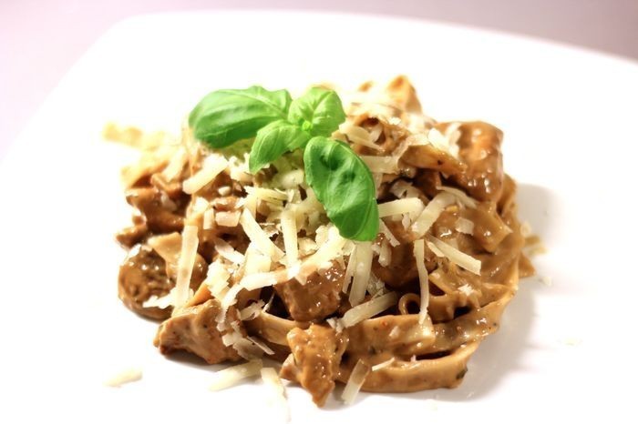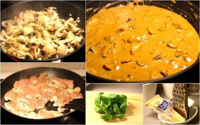 Koka pasta. Skär champinjoner i kvartar, hacka lök och vitlök. Stek i en stekpanna tills allt får en brun fin färg. Tillsätt mjöl och rör om. Tillsätt mjölken och grädden under omröring. Låt koka några minuter och skär kycklingen i bitar under tiden. Stek kycklingen i en annan stekpanna tills den är färdig och krydda med salt och peppar. Blanda ner kycklingen i pastasåsen och rör ner hackad basilika. Smaka av med salt, peppar, soya och vinäger/citronsaft. Blanda ner den kokta pastan och servera med riven parmesanost.