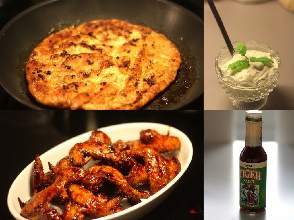 Marinera vingarna i olivolja, citron och kryddor. Stek i ugnen på 200° i ca 30-40 minuter. Gör under tiden mynta-yoghurtsåsen, blanda ihop alla ingredienser och låt stå kallt. När vingarna är färdiga ska dem friteras. Man kan antingen fritera i en fritös eller i en kastrull. Jag friterade i en liten kastrull och gjorde då så här. Fyll upp med mat/rapsolja så att det täcker två vingar som ligger på botten. Sätt på högsta värmen och låt oljan bli riktigt varm. Man kan kasta ner en liten brödbit och se ifall oljan har nått rätt temperatur. Brödbiten ska bli mörkbrun på en minut isåfall. Jag la ner två vingar åt gången och lät dem ligga i tills dem fick en fin gyllenbrun färg. När alla vingarna är färdigfriterade häll då tigersåsen i en liten kastrull och låt den koka upp. Späd med 2 msk vatten och låt koka i 2 minuter. Häll sedan såsen över vingarna och blanda ordentligt så att vingarna täcks helt. Låt svalna lite. Lägg smöret i en skål och värm några sekunder i micron. Blanda sedan med en pressad vitlöksklyfta. Bre smöret på brödet och stek några sekunder på varje sida i stekpannan.