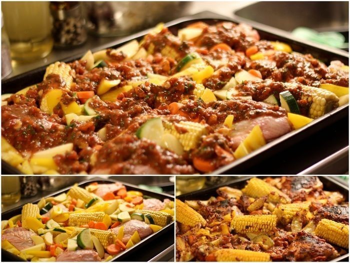 Dela majskolvarna, skär grönsakerna och potatisen i bitar/klyftor. Fördela allt på en lätt oljad plåt tillsammans med kycklinglåren. Blanda ihop krossade tomater, persilja, hackade vitlöksklyftor, ayvar, salt och peppar i en bunke. Häll över allt och grilla i ugnen på 175°-200° i ca 45-50 minuter.