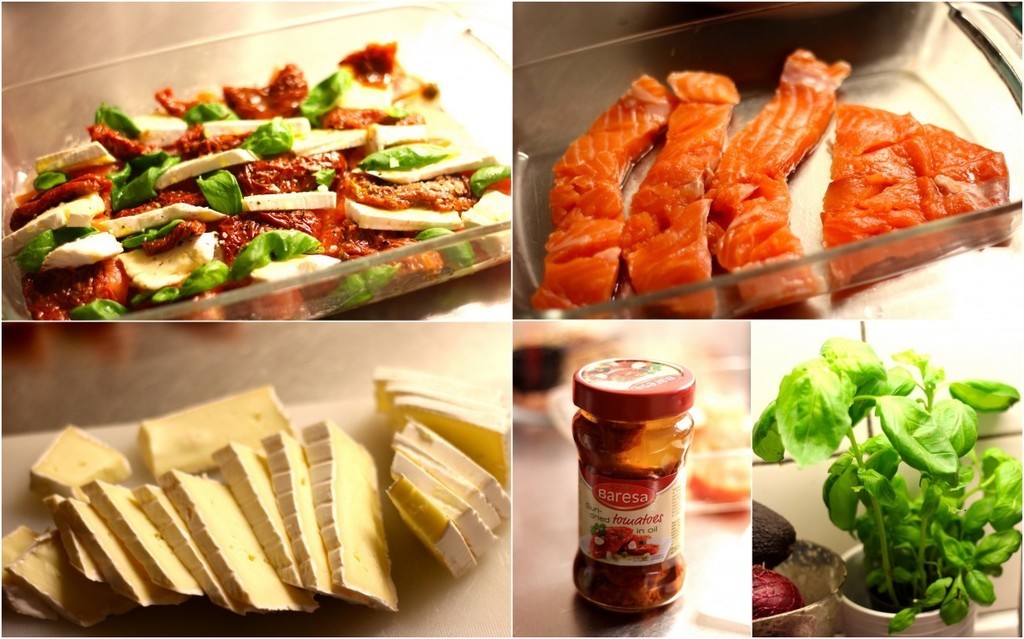 Lägg laxen i en ugnsform och skär två-tre snitt i varje bit. Varva brieost och soltorkade tomater i varje snitt och strö över färska basilika blad. Krydda och in i ugnen på 200° i ca 20 minuter eller tills laxen har fått en fin gyllen brun färg.