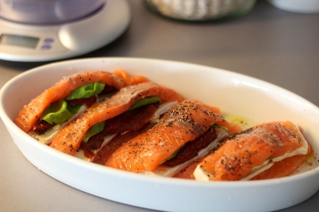 Skär en skåra i varje laxfilé. Lägg två skivor brieost, två st soltorkade tomater och två st basilikablad i varje laxfilé. Ringla över olivolja och krydda. In i ugnen i ca 20-25 minuter på 200°. Enkelt, nyttigt och framförallt så gott!
