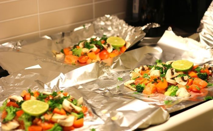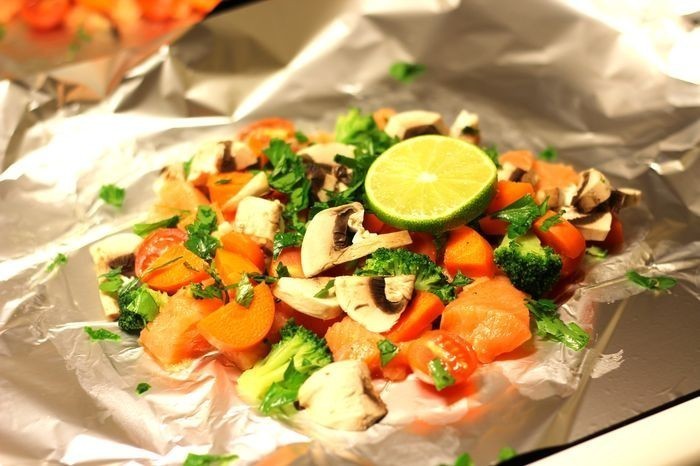 Klipp/riv ut 3 st rejäla ark aluminiumfolié som du smörjer in med antingen smör eller olja. Skär lax, broccoli, champinjoner, cocktailtomater och morötter i bitar och fördela jämt på arken. Hacka persilja och stö över. Skär tre skivor lime och pressa en skiva på varje ark. Krydda efter smak och lägg i den urpressade limen i paketet. Vik ihop sedan paketen ordentligt. Grilla i ugnen på 200-225° 15-20 minuter.