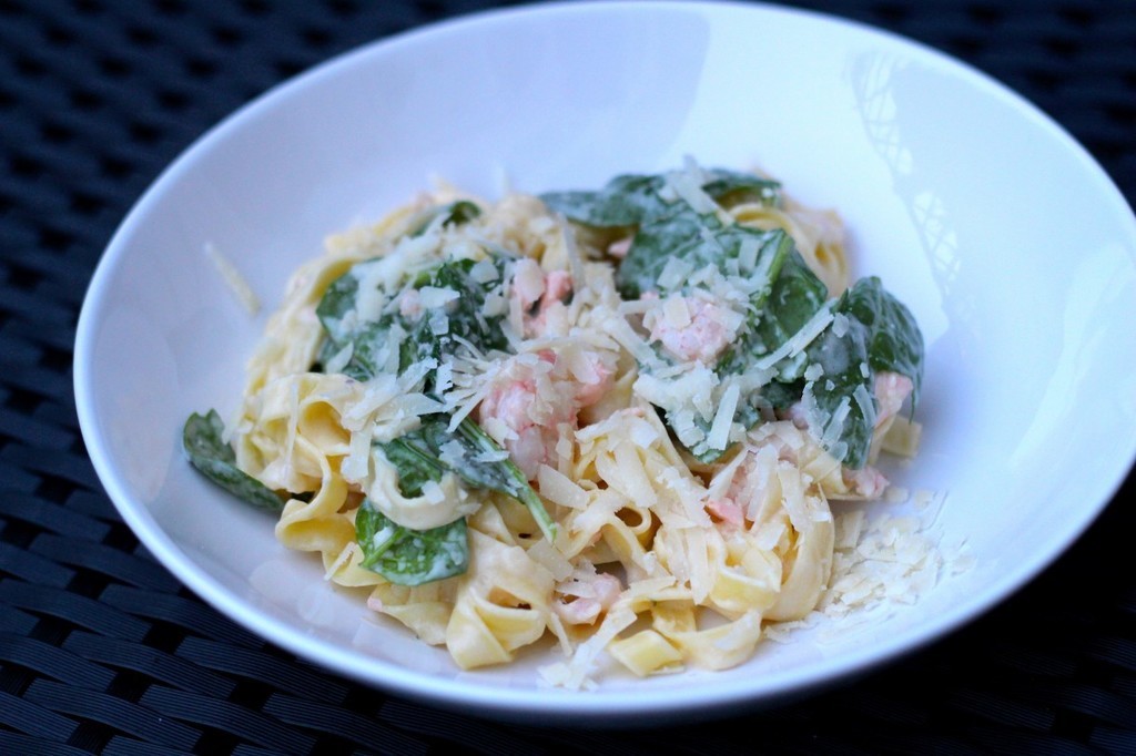 Koka pastan i lättsaltat vatten. Hacka lök och vitlök fint. Tärna laxen. Stek lök mjukt. Rör ner crème fraiche, grädde och citronsaft. Pressa ner vitlöksklyftan och låt koka upp. Sänk värmen och rör ner laxen. Låt puttra i några minuter tills laxen är genomkokt. Smaka av med salt & peppar. Blanda ner räkor och låt puttra med i några sekunder. Ta bort från plattan och blanda ner pasta och spenat. Servera med lite riven parmesan.