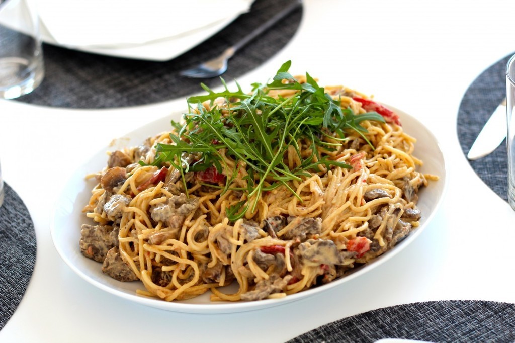 Koka pastan. Skär grönsaker och biff i bitar och stek tills allt är färdigt. Överstek inte för då blir biffen seg. Hellre lite rosa än gummi! Blanda ner grädde, creme fraiche och senap. Krydda med salt, peppar, chiliflingor eller sambal. Låt puttra någon minut och blanda sedan ner spaghetten. Servera med lite färsk ruccola! Bon aptit!