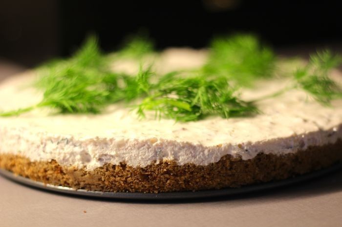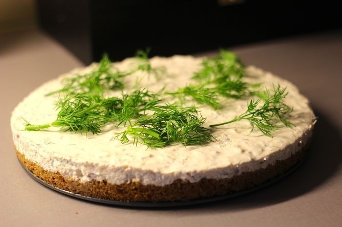 Smält smöret. Finhacka kavringen i en matberedare och tillsätt smöret. Lägg brödmixen i en springform och platta ut. Blötlägg och smält gelatinbladen. Blanda samman övriga ingredienser och smaksätt med salt och peppar. Häll i gelatinet och blanda noggrant. Häll smeten i formen med kavring. Låt stå i kylen ca 3-4 timmar, eller tills cheesecaken har stelnat. Bred sikrom på toppen och garnera med dillkvistar.