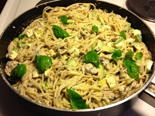 Koka spaghettin och tärna kycklingfilén. Stek kycklingfilén och krydda med salt & peppar. Tillsätt grädde, crème fraîche och pesto. Låt koka upp och sjud en liten stund. Smaka av eventuellt med mer salt & peppar. Ta från plattan och blanda ner tärnad fetaost, tärnad avocado & spaghetti. Servera med lite parmesan ost om det finns.