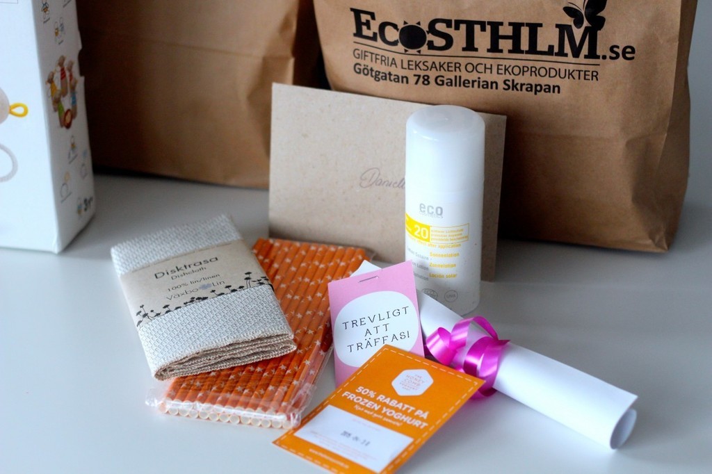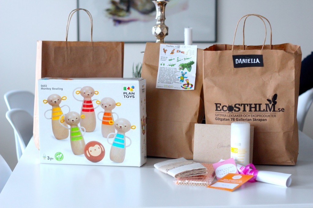 Det som fick följa med från Ecosthlm var bland annat bowlingsetet i trä och påsen med playmais. I goodiebagen fick vi rabattcheckar, solskydssfaktor, disktrasa i linnétyg och ett paket sugrör