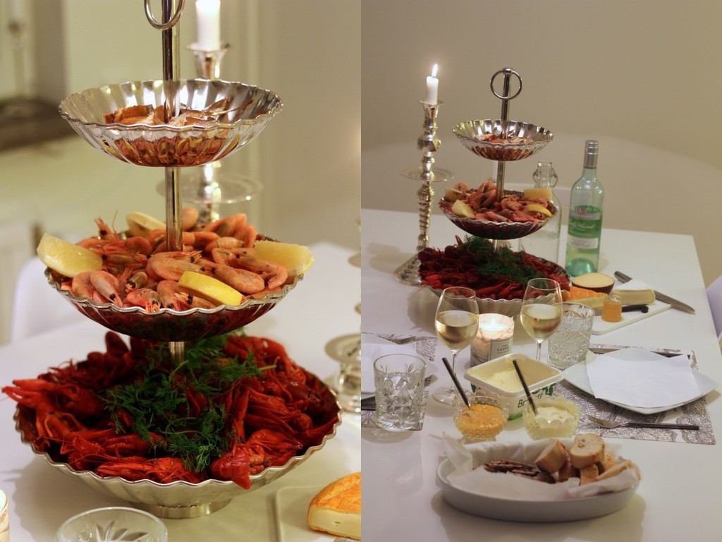 kräftor, räkor, rökt lax, Lindemans vita vin