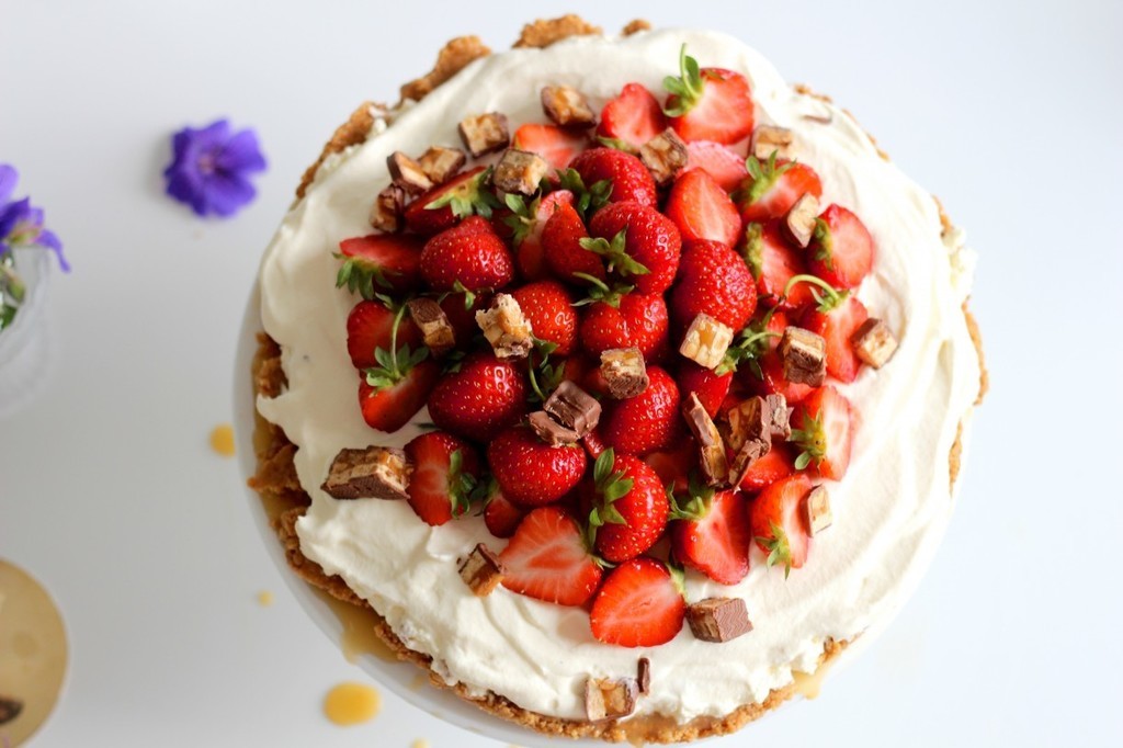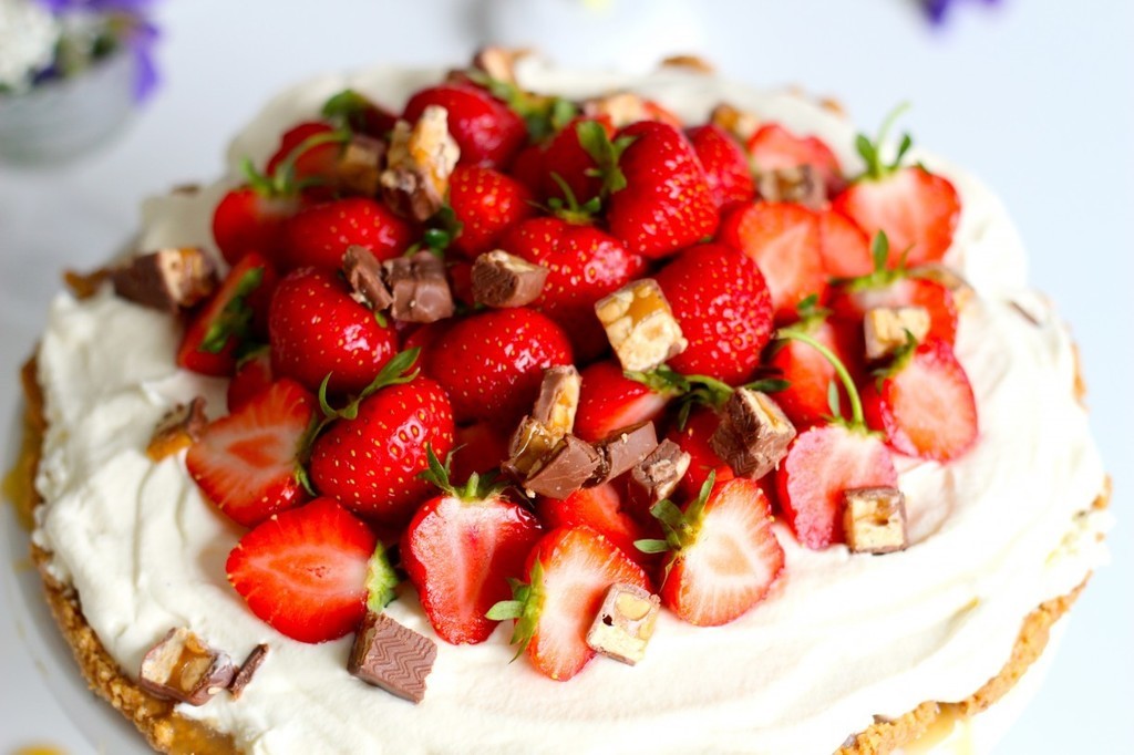 Topping: Vispa grädden och hacka snickersen. Blanda ner snickersen i grädden men spara lite till garnering. Toppa med jordgubbar & hackad daim.
